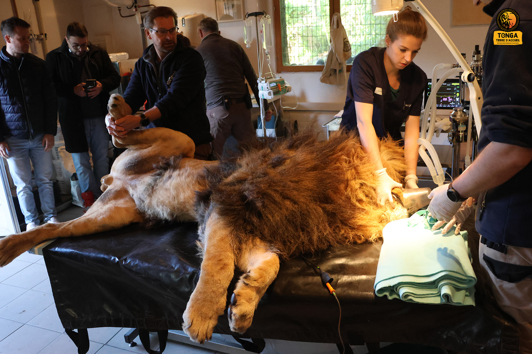Yembé, notre lion sauvé du trafic en 2020 par notre association Tonga Terre d'Accueil qui est de retour au sein de l'Espace Zoologique avec ses deux femelles Shenzi et Asili, a subi une deuxième chirurgie de greffe osseuse.