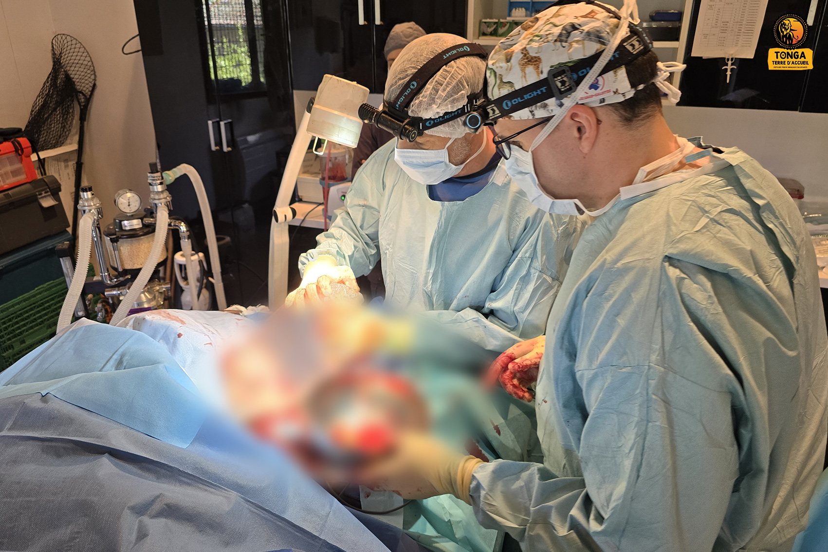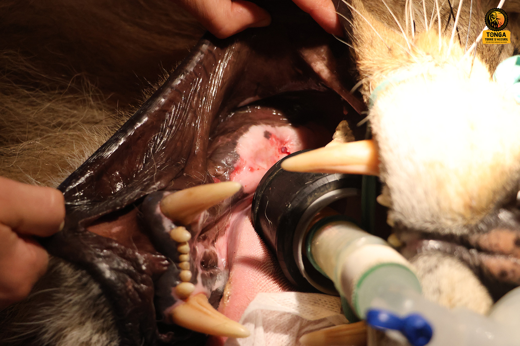 Cette allogreffe sur un lion était une première mondiale ! Elle a été réitérée pour la deuxième fois aujourd'hui : l'objectif était de retirer la dernière dent coincée, la molaire caudale, logée plus profondément encore dans l'os et de cureter les kystes autour. L'opération, qui a duré plus de trois heures, a été la moins invasive possible. L'abord chirurgical a été réalisé par un trou d'une taille inférieure à une pièce de deux euros ! La dent a été retirée par petits bouts via cet accès, et la greffe a été insérée avec précision dans la cavité laissée par la dent et les kystes curetés.