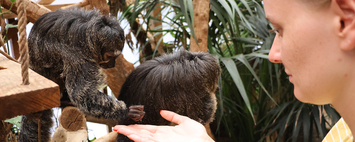 - Nourrissage des capucins à la main dans leur serre tropicale.*