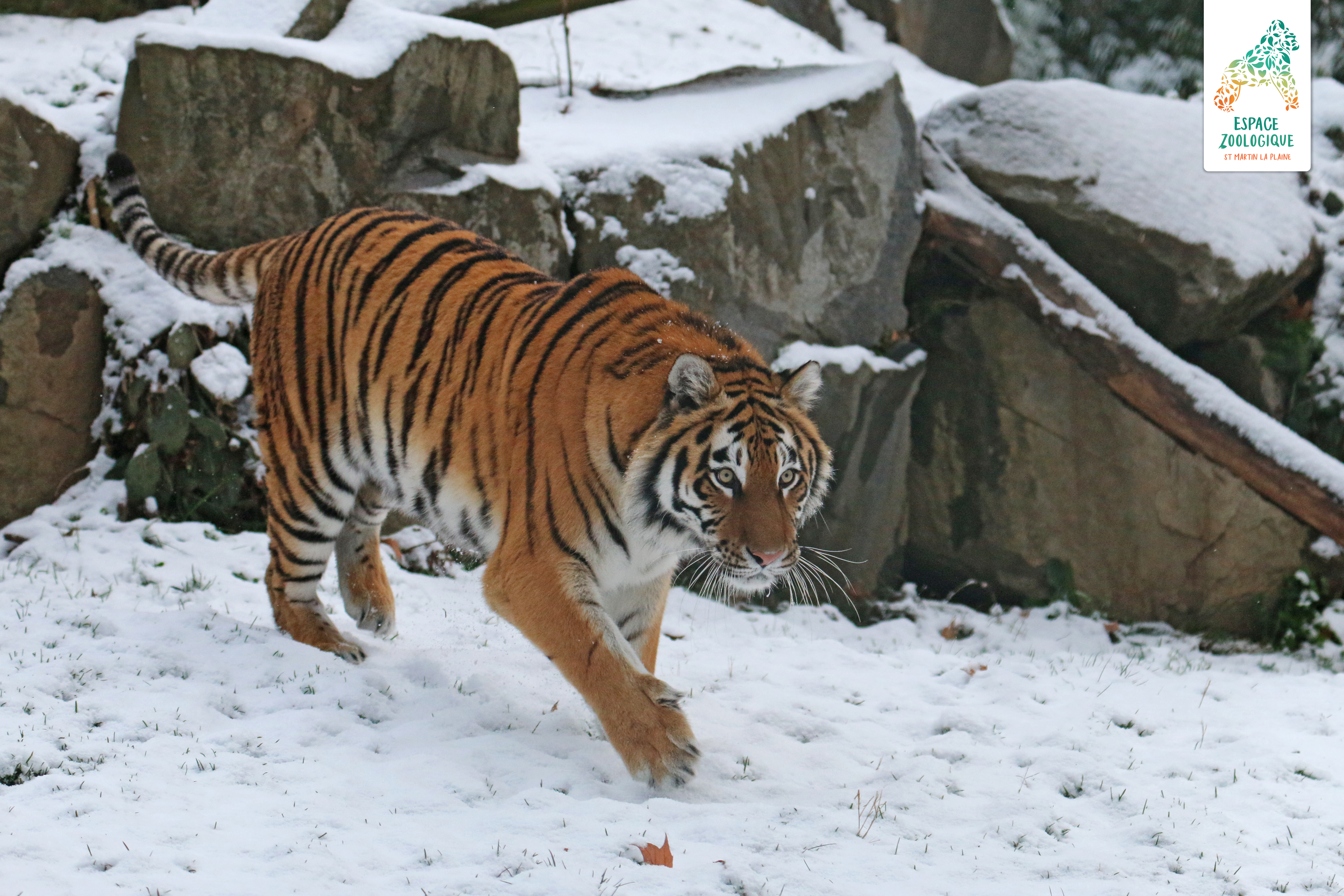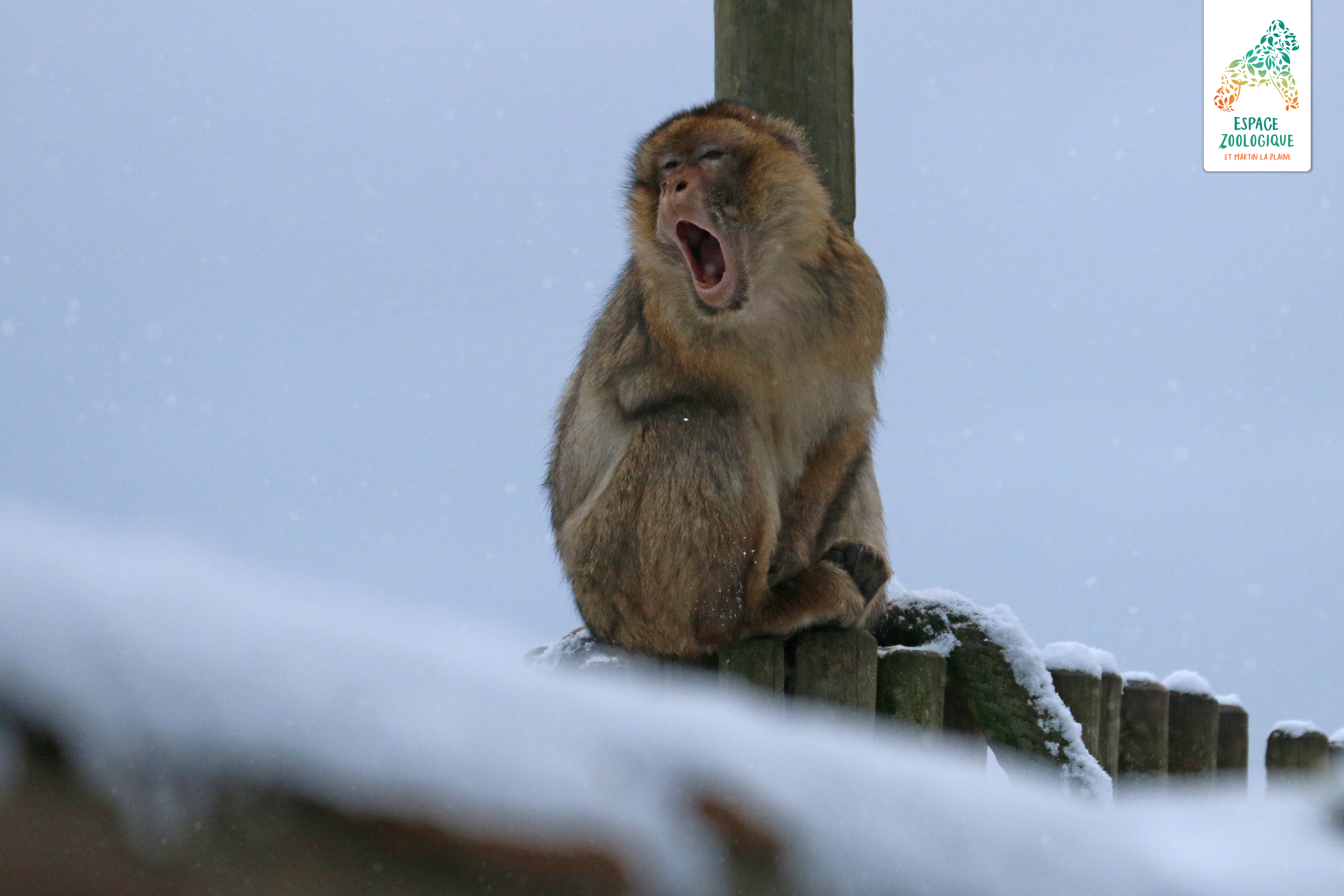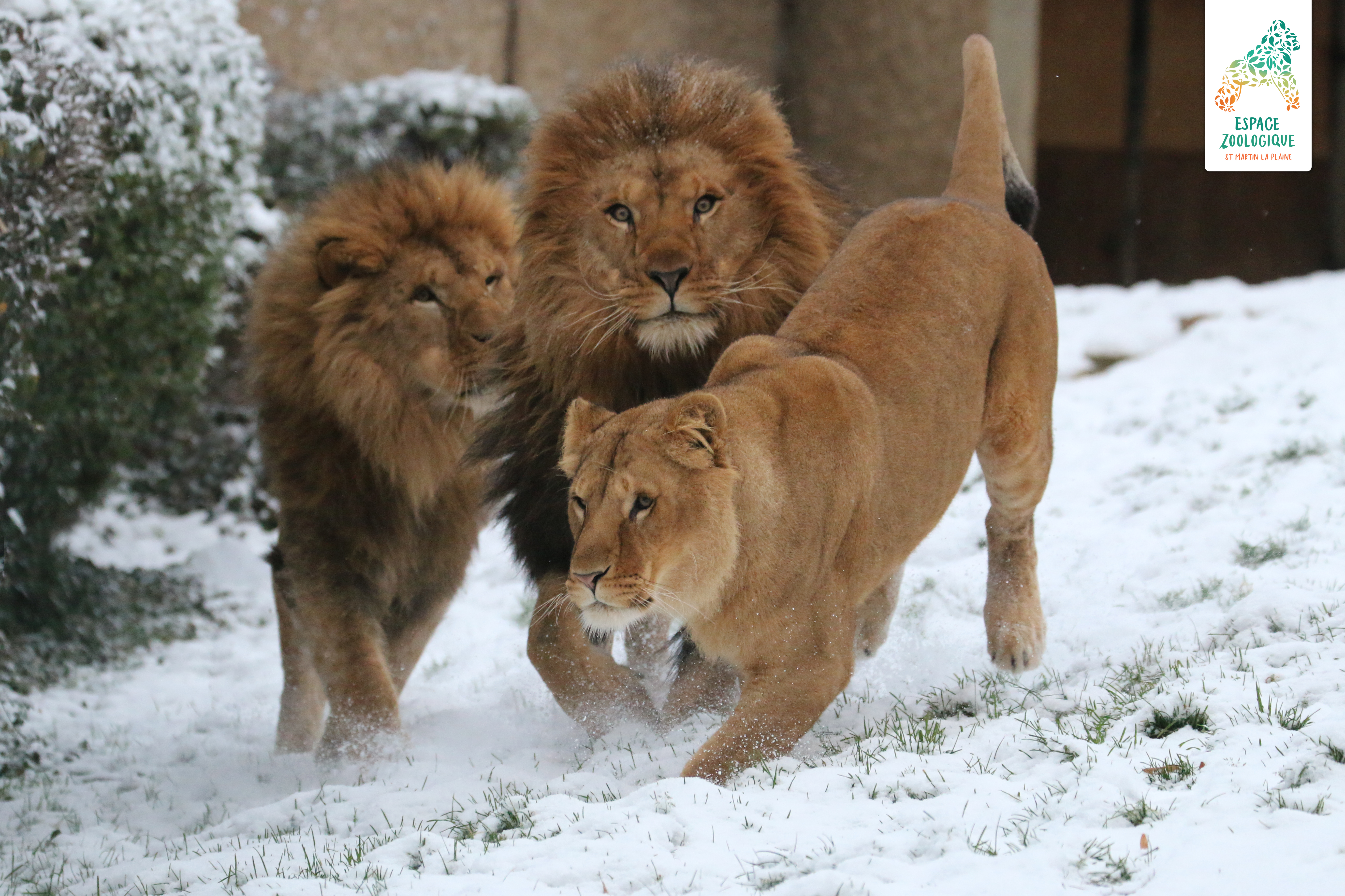 Hormis les Macaques de Barbarie, une espèce adaptée au froid des montagnes de l'Atlas, la majorité des primates ne sort pas en extérieur dans ces conditions. C'est en revanche un vrai plaisir pour les lynx, les loups, les tigres, les panthères des neiges mais aussi les lions ! Car même s'il s'agit d'une espèce africaine, c'est un animal robuste qui supporte très bien le froid et qui se roule à cœur joie dans la neige.