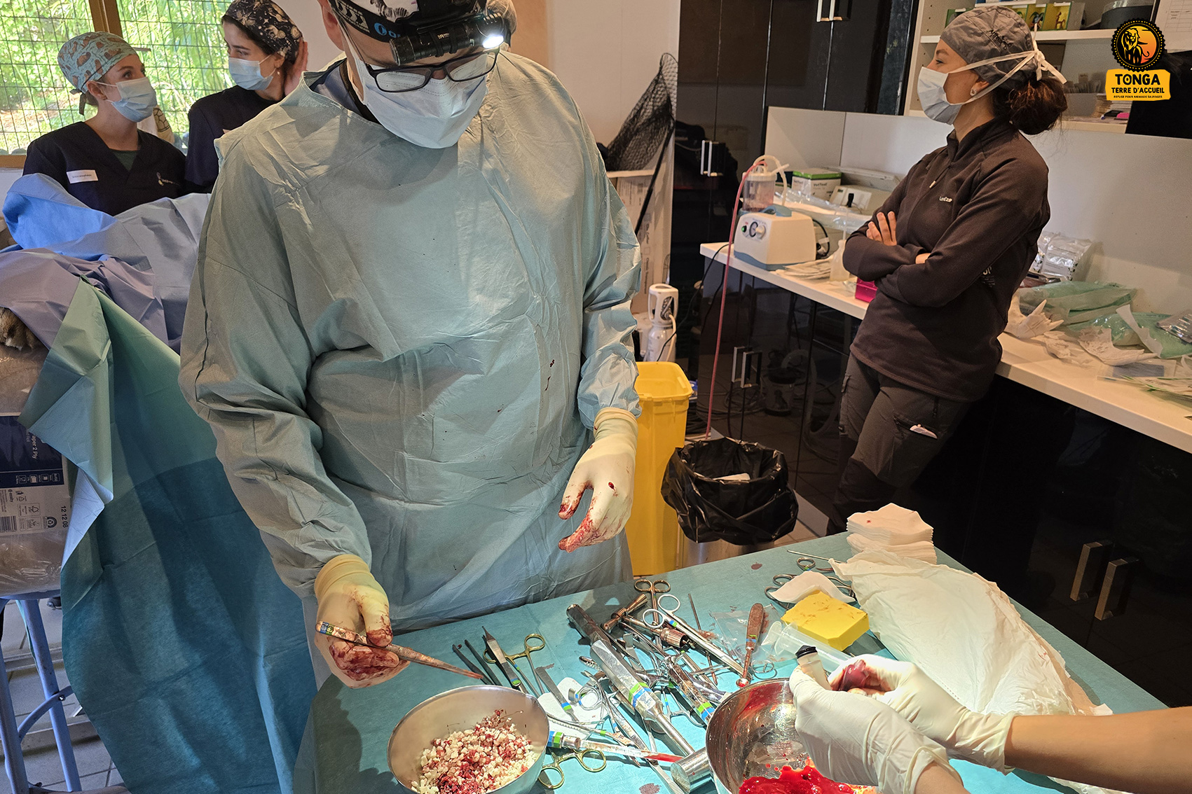 Cette allogreffe sur un lion était une première mondiale ! Elle a été réitérée pour la deuxième fois aujourd'hui : l'objectif était de retirer la dernière dent coincée, la molaire caudale, logée plus profondément encore dans l'os et de cureter les kystes autour. L'opération, qui a duré plus de trois heures, a été la moins invasive possible. L'abord chirurgical a été réalisé par un trou d'une taille inférieure à une pièce de deux euros ! La dent a été retirée par petits bouts via cet accès, et la greffe a été insérée avec précision dans la cavité laissée par la dent et les kystes curetés.
