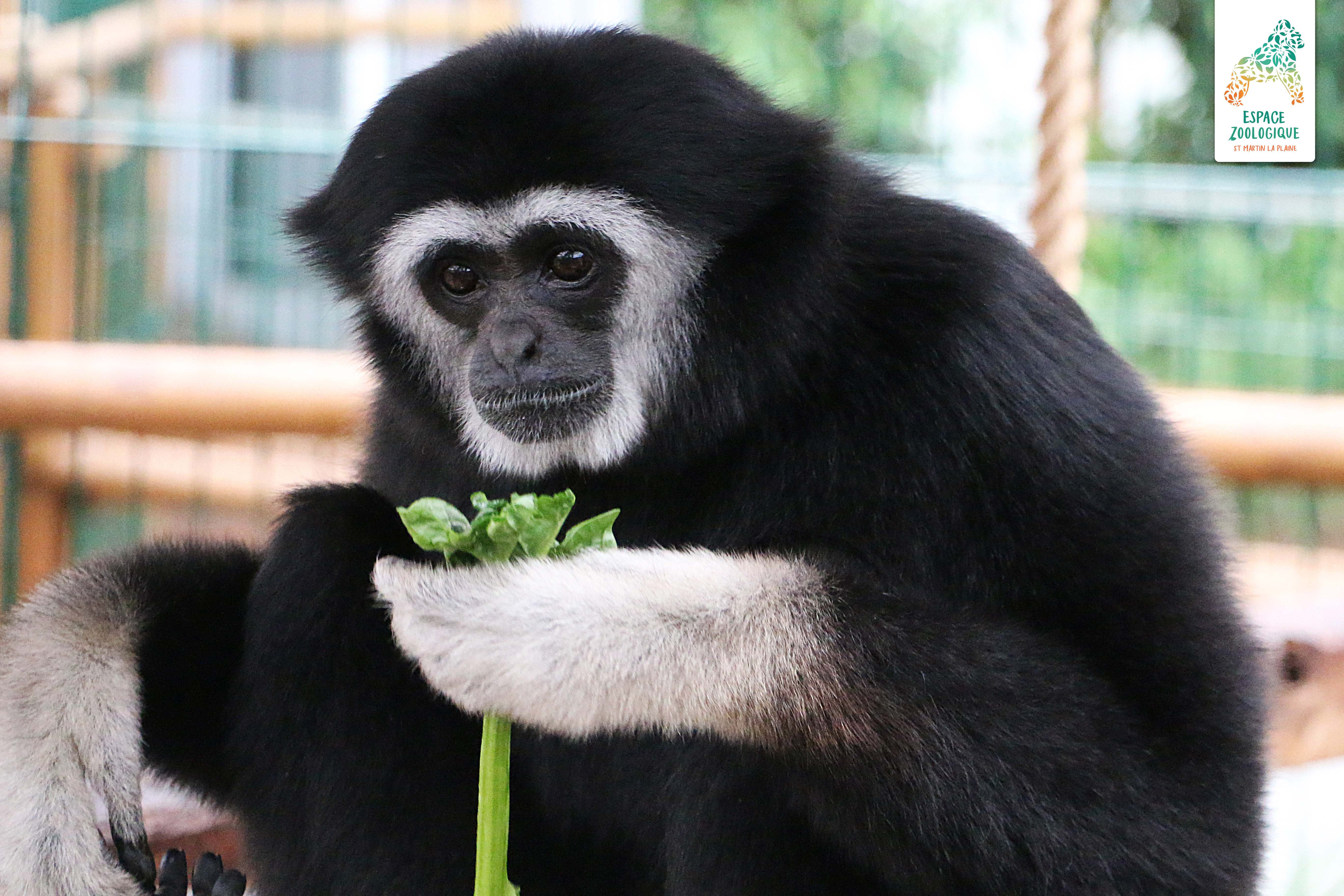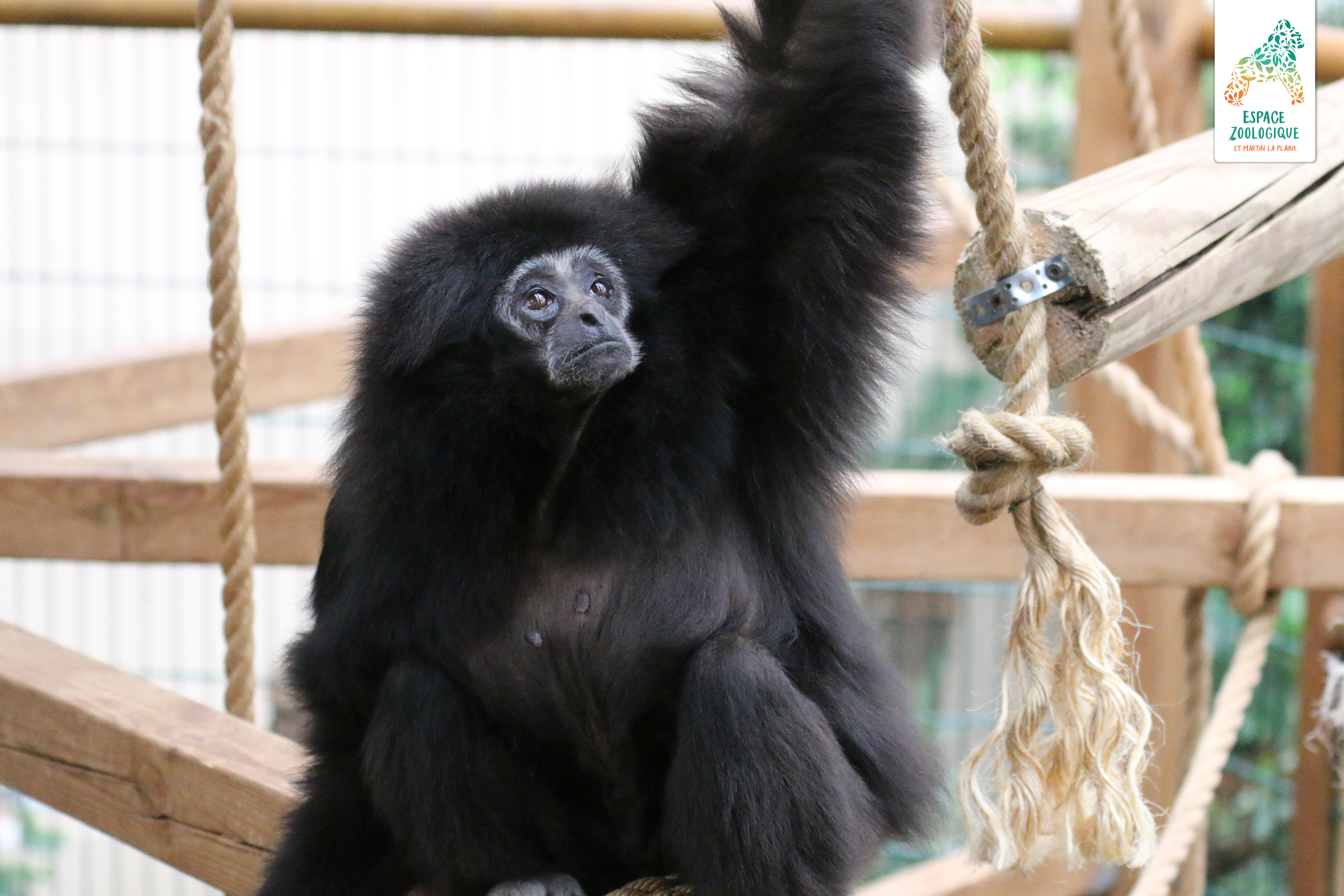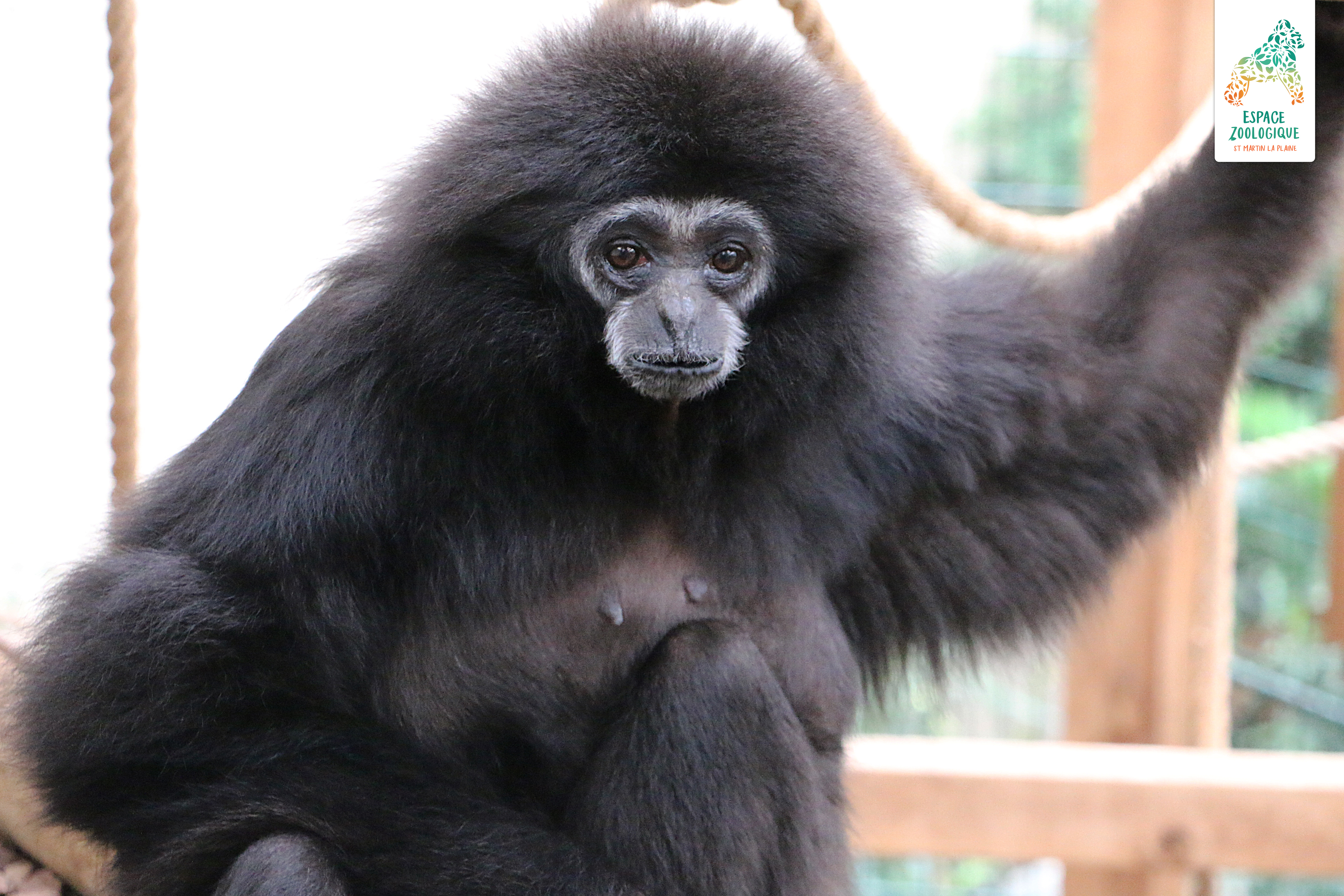 Junior, notre gibbon né ici à Saint-Martin-la-Plaine en 2012, vient de faire connaissance avec Gipsy, sa nouvelle copine née au Zoo Hoyerswerda en Allemagne.