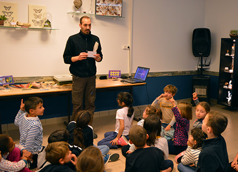Supports pédagogiques : vidéoprojecteur, vidéos, peau, plumes, insectes, araignées, scorpions, carapace, mues, jeux pédagogiques.
